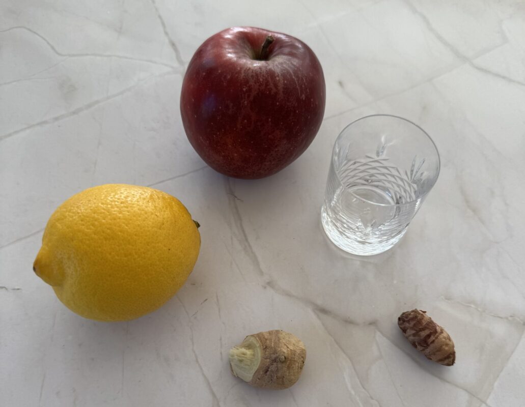 Denne morgen detox shot kombinerer den opfriskende syrlighed fra citron, den varme styrke fra ingefær, de antiinflammatoriske egenskaber fra gurkemeje og den naturlige sødme fra æble.